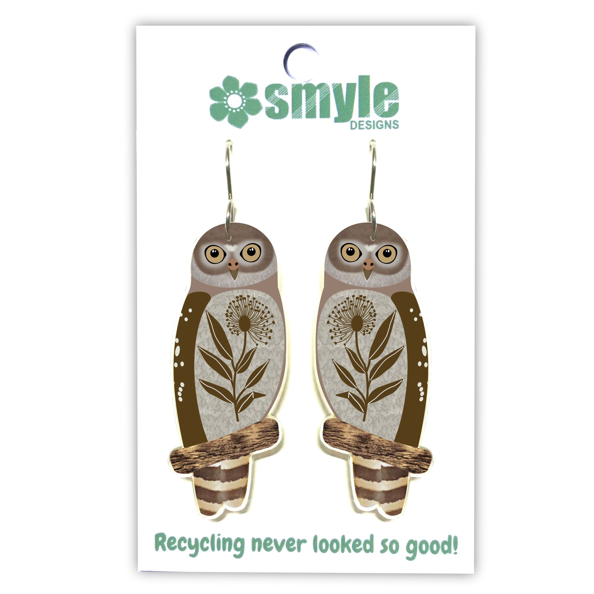 Our Barking Owl earrings began as an original illustration in our home studio and have been thoughtfully transformed into lightweight earrings using recycled plastics - right here in Brisbane, Australia.