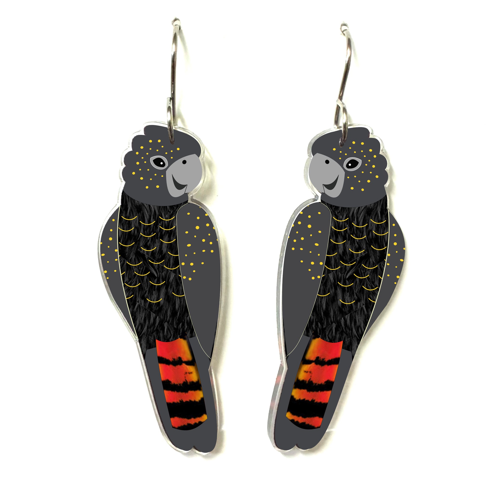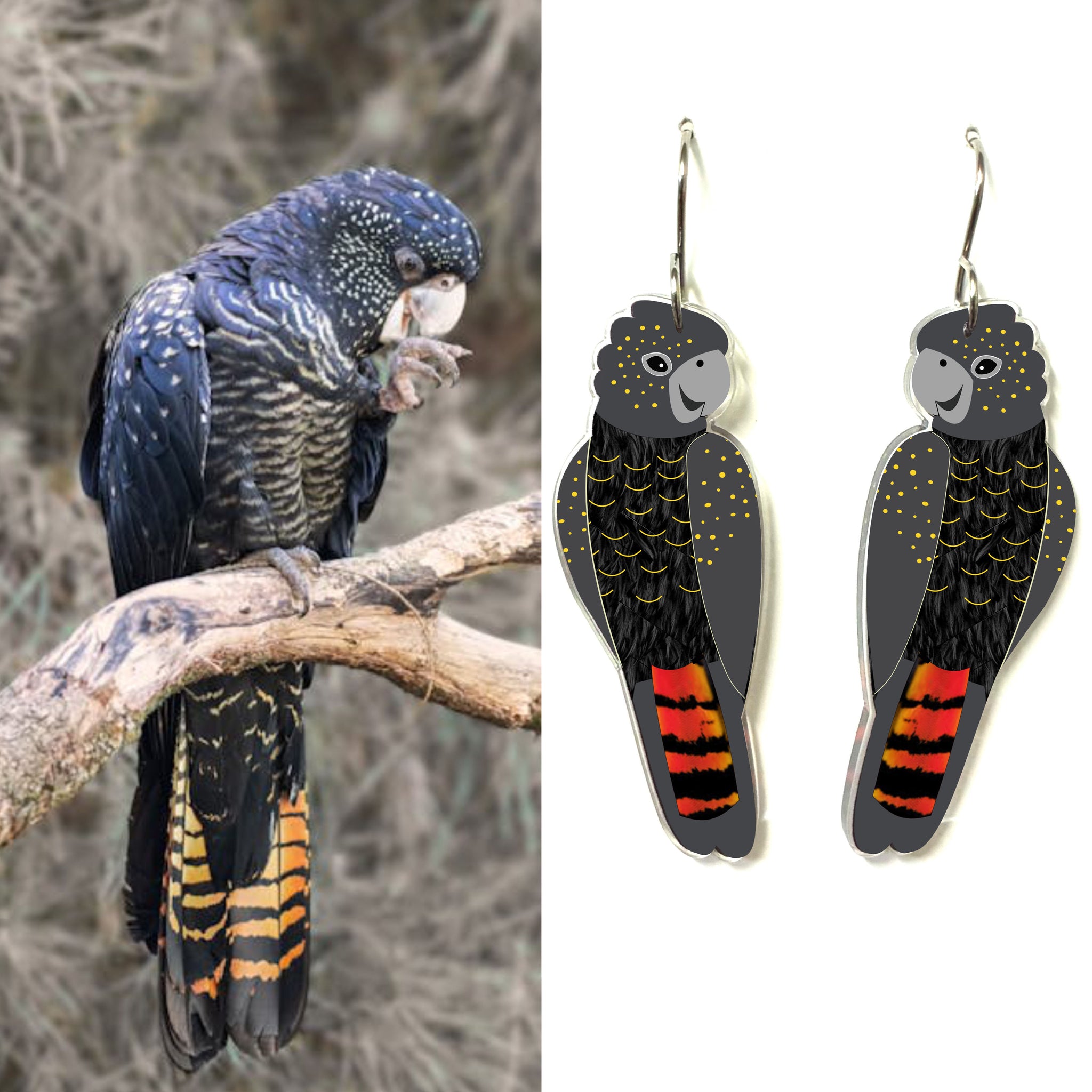 Our Black Cockatoo earrings began as an original illustration in our home studio and have been thoughtfully transformed into beautiful earrings using recycled plastics - right here in Brisbane, Australia.
