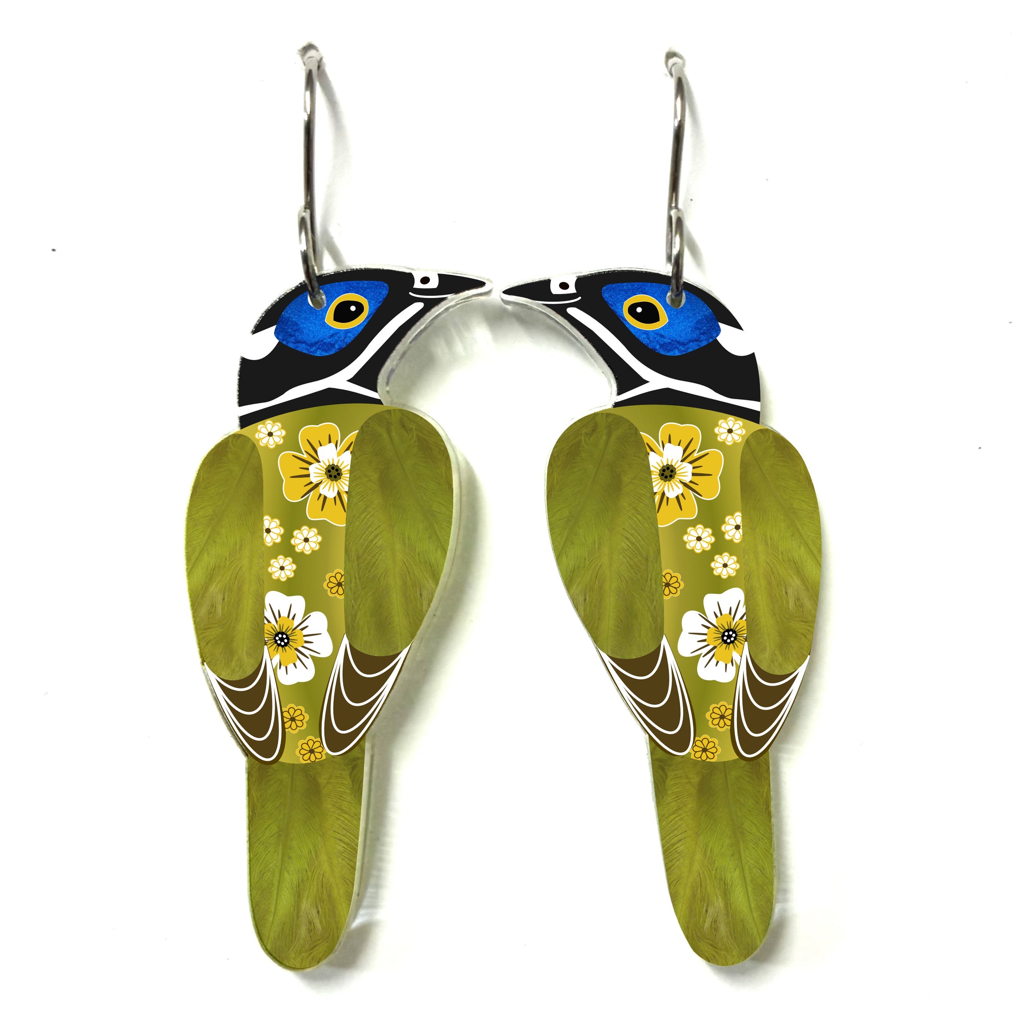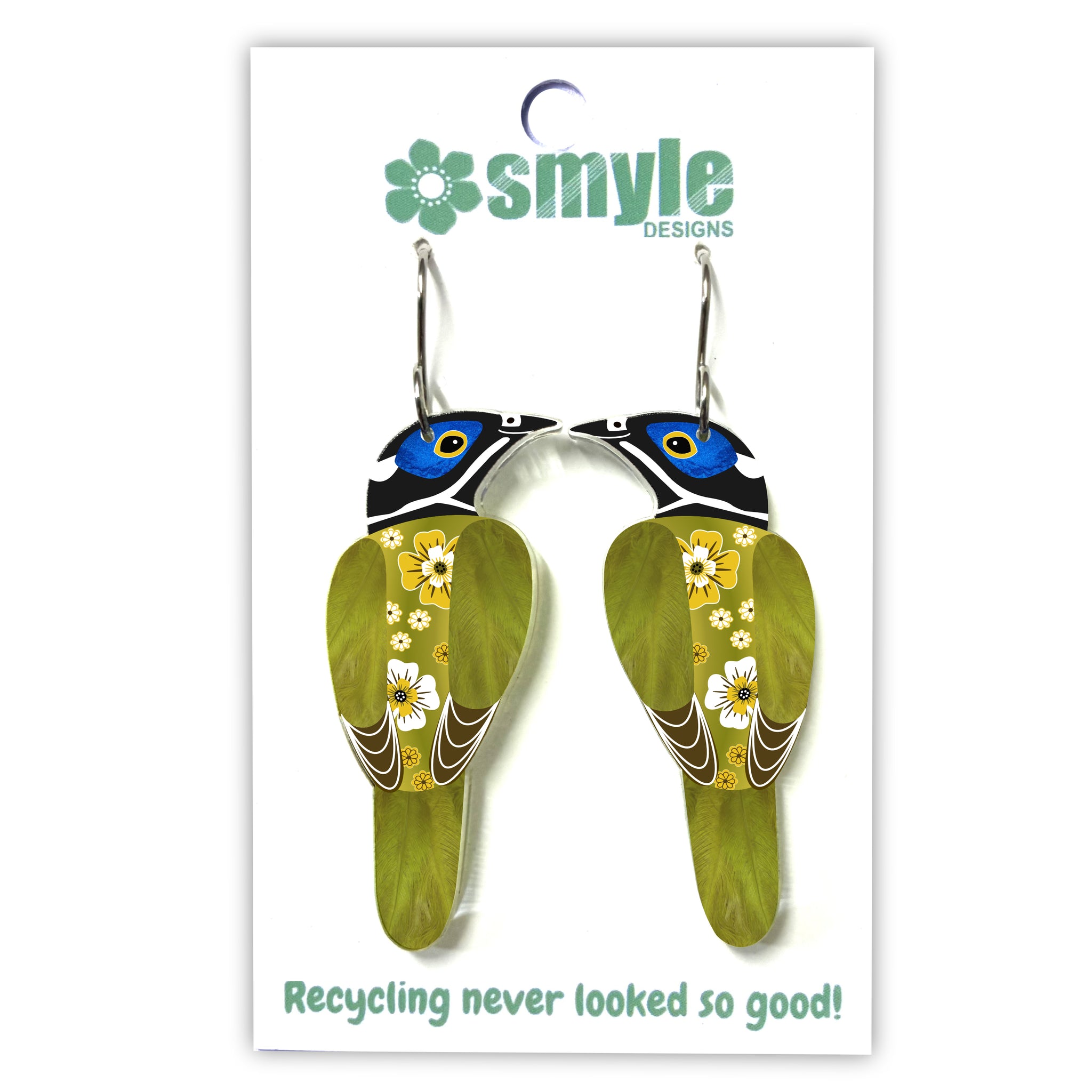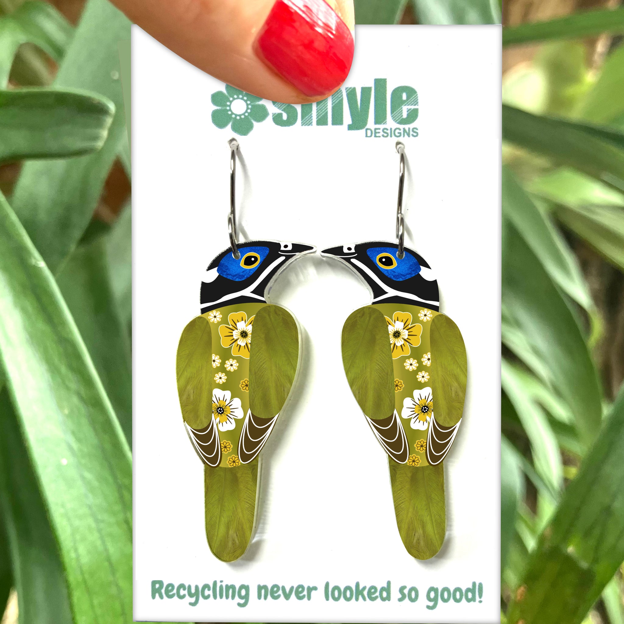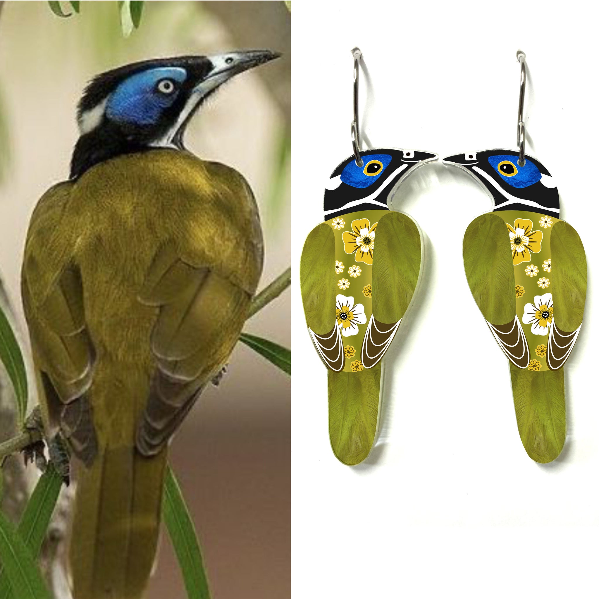 Our Blue-Faced Honeyeater earrings began as an original illustration in our home studio and have been thoughtfully transformed into lightweight earrings using recycled plastics - right here in Brisbane, Australia.