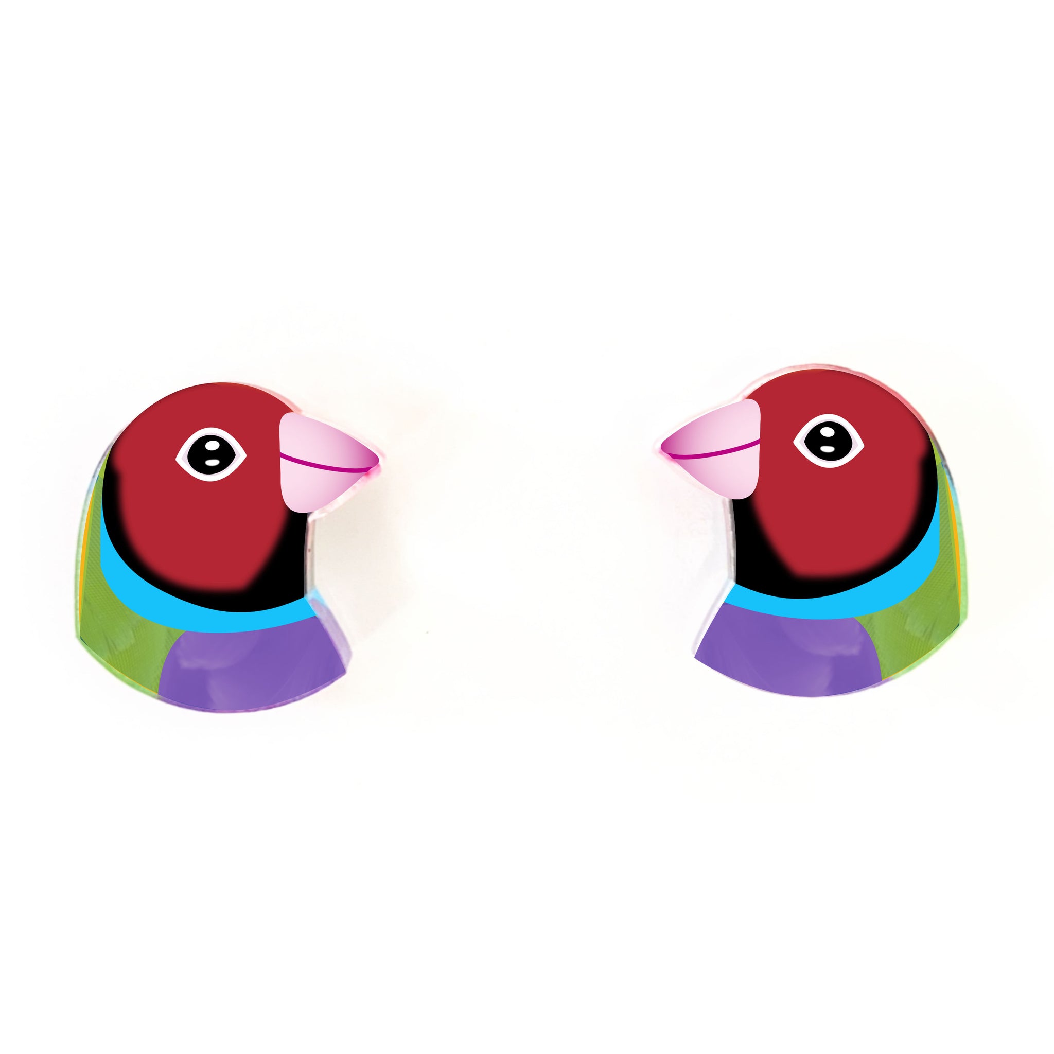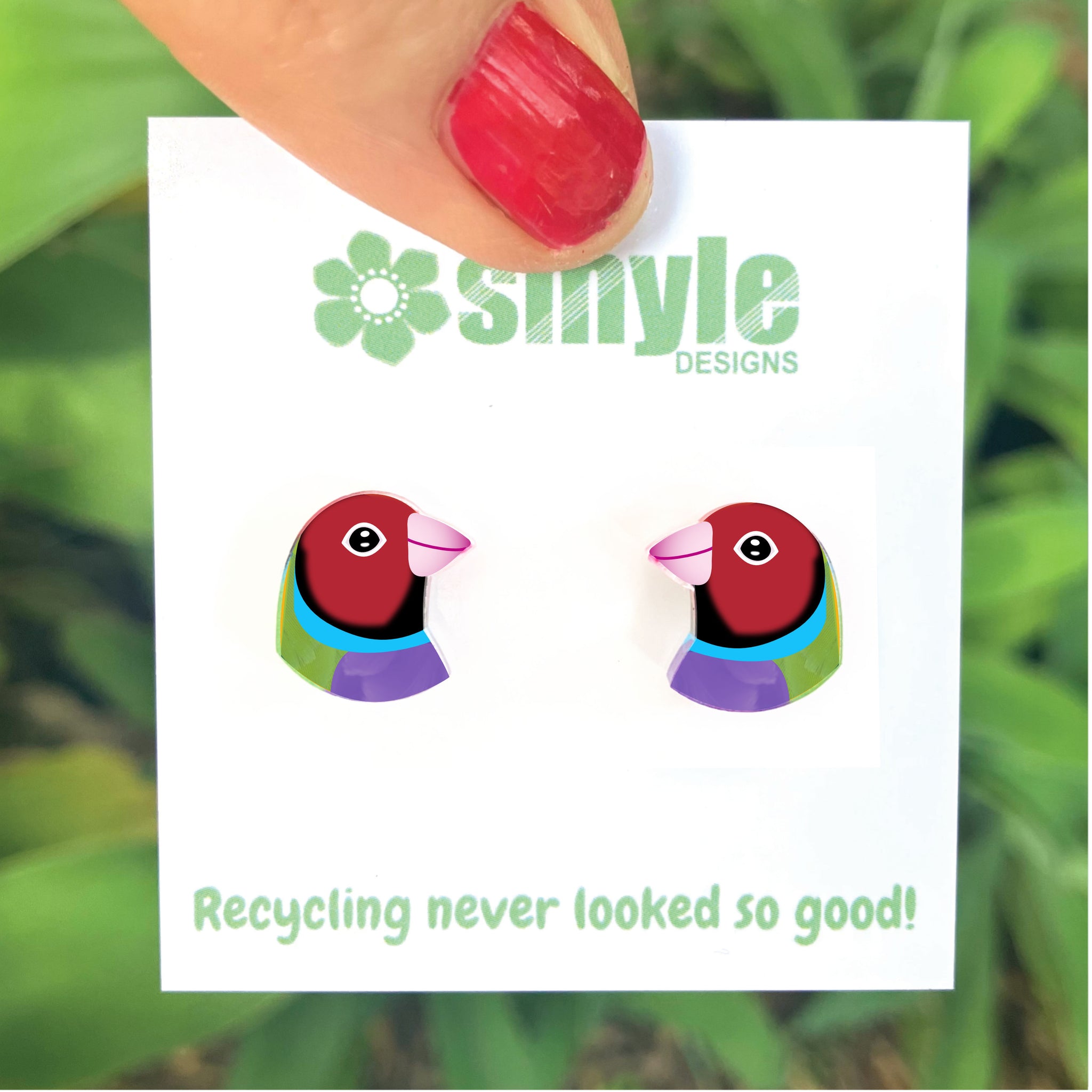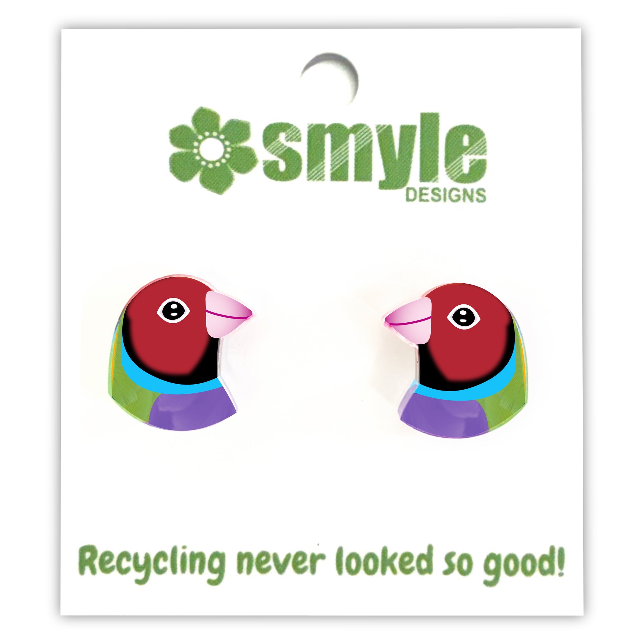 Our Gouldian Finch earrings began as an original illustration in our home studio and have been thoughtfully transformed into lightweight earrings using recycled plastics - right here in Brisbane, Australia.