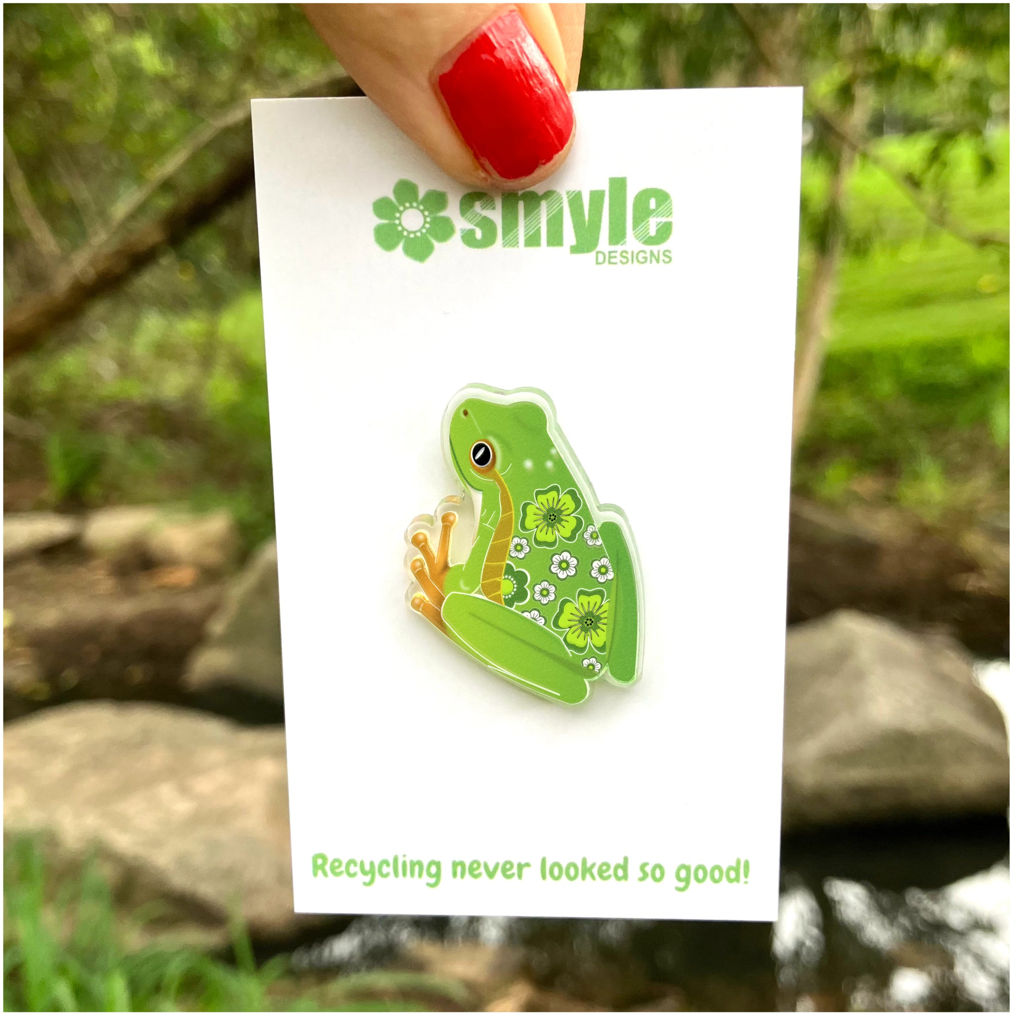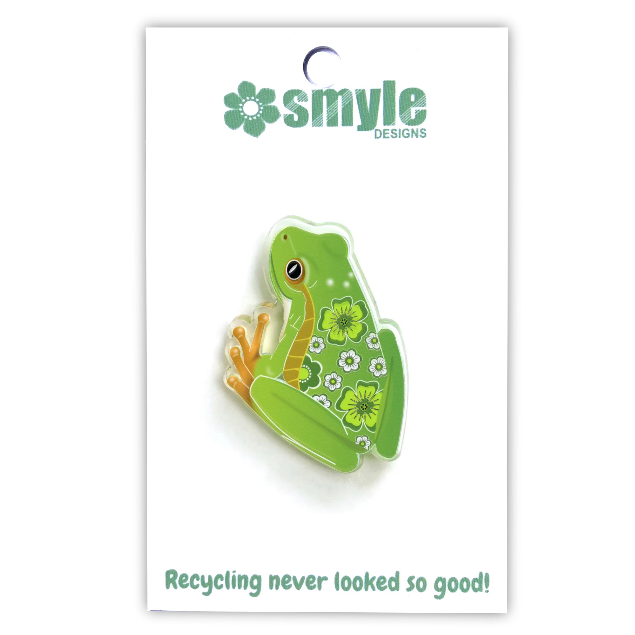 Our Green Tree Frog pins began as an original illustration in our home studio and have been thoughtfully transformed into beautiful pins using recycled plastics - right here in Brisbane, Australia.
