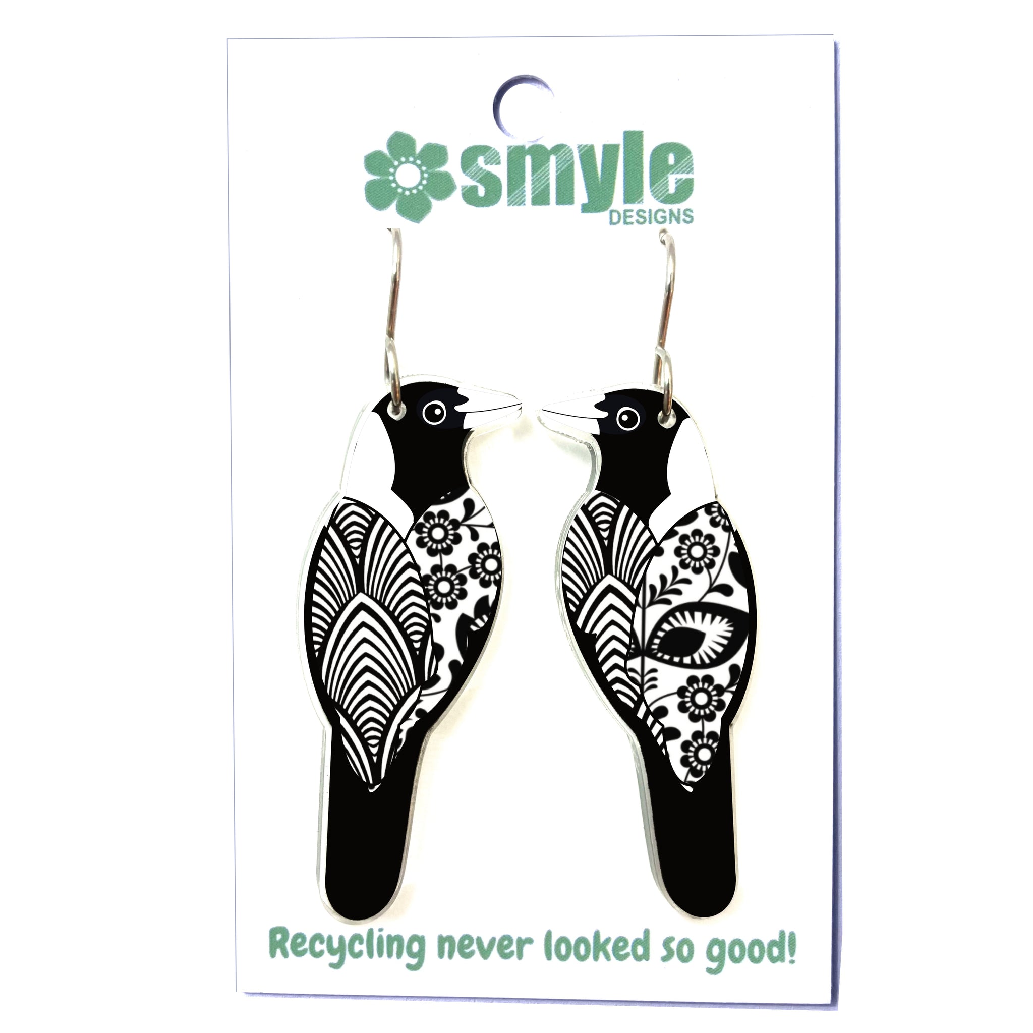 These Magpie earrings began as an original illustration in our home studio and have been thoughtfully transformed into lightweight earrings using recycled plastics - right here in Brisbane, Australia.