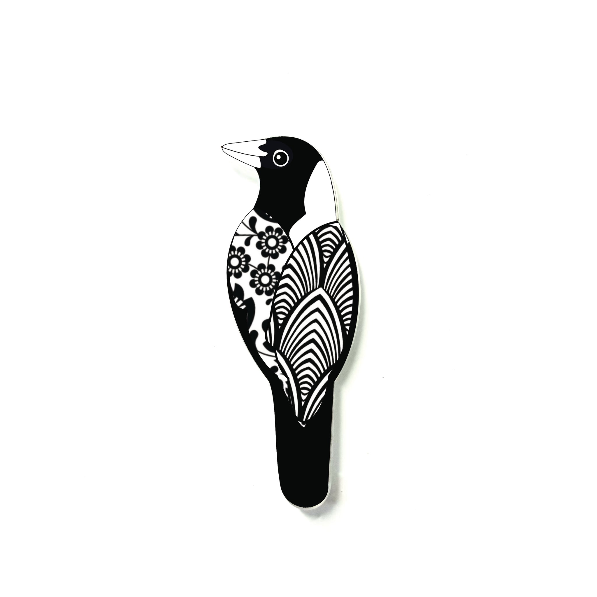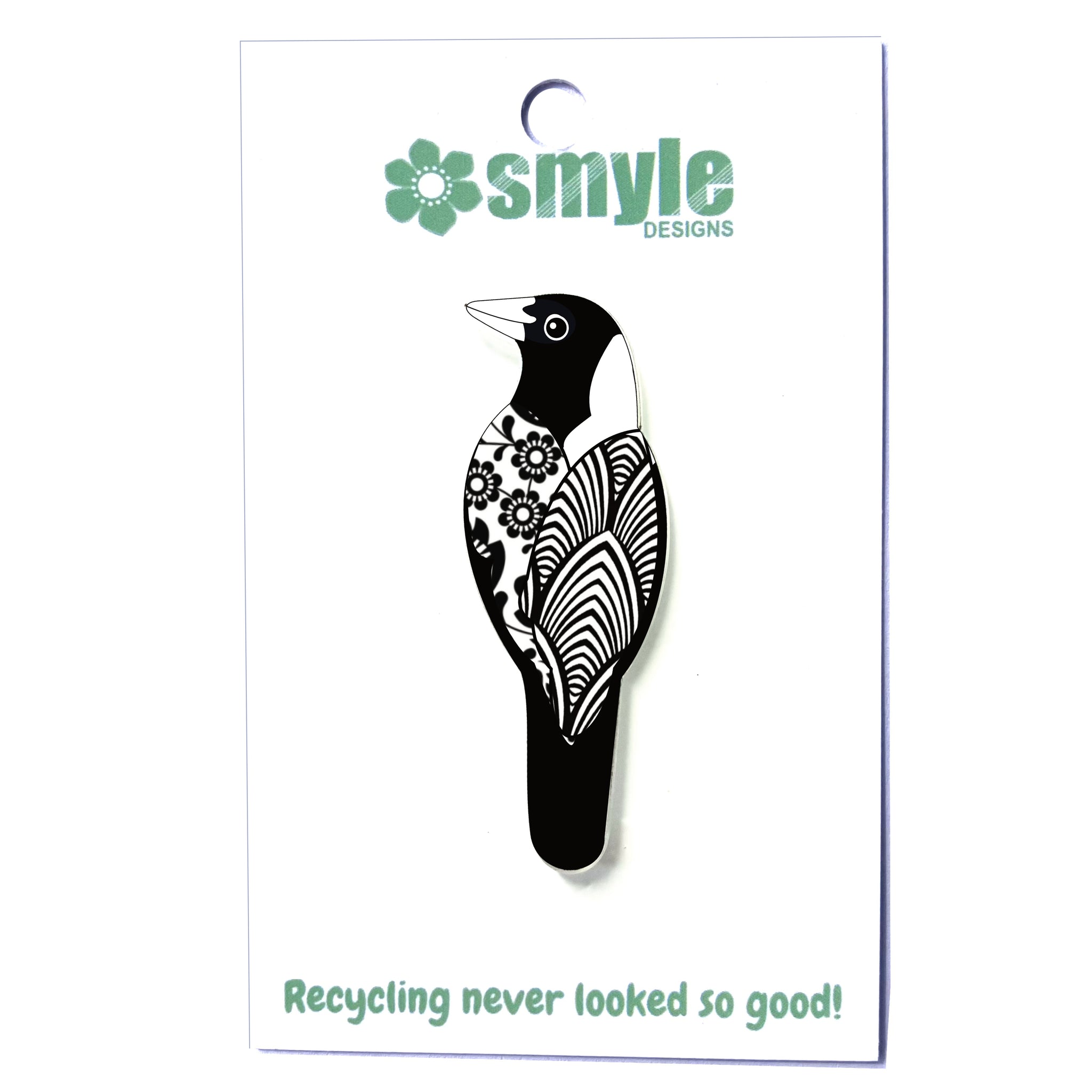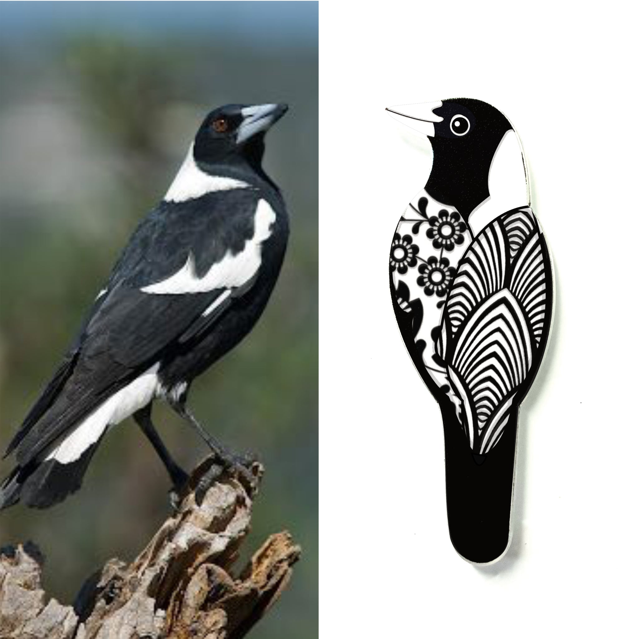 Our Magpie pins began as an original illustration in our home studio and have been thoughtfully transformed into lightweight pins using recycled plastics - right here in Brisbane, Australia.