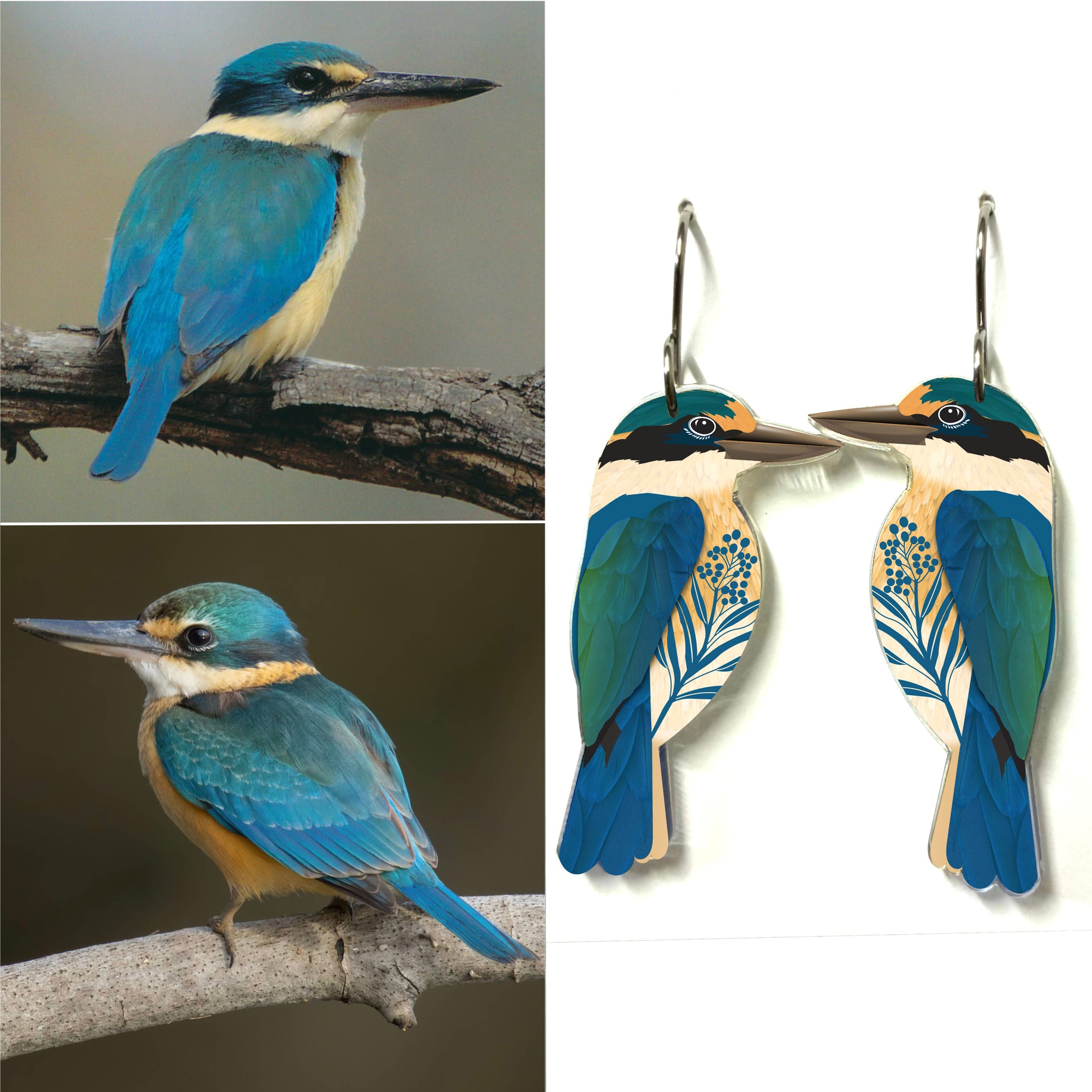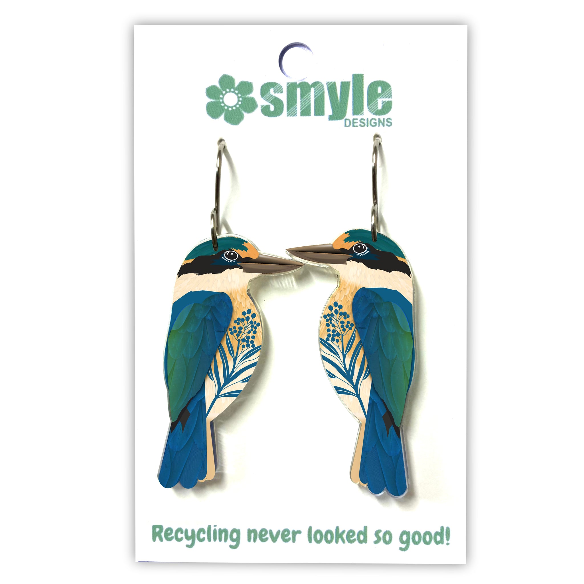 Our Sacred Kingfisher earrings began as an original illustration in our home studio and have been thoughtfully transformed into lightweight earrings using recycled plastics - right here in Brisbane, Australia.